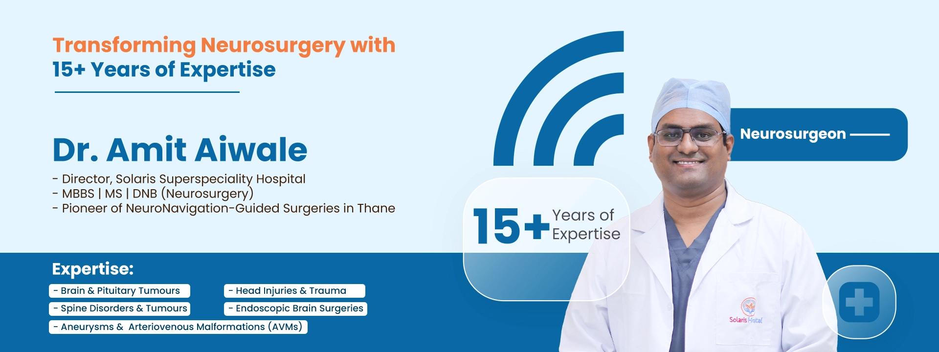 With over 15 years of dedicated practice, Dr. Amit Aiwale is a seasoned neurosurgeon in thane, making significant contributions to the field of neurosurgery. Dr Amit Aiwale is Director at Solaris Superspeciality Hospital where he has state of art Neurosurgical facilities like NeuroNavigation guided Brain Surgeries and Spine Surgery. His commitment to patient care is reflected in his association with esteemed hospitals such as Bethany Hospital, Kaushalya Hospital, Thane Healthcare, Godbole Hospital, Mahavir Jain Hospital, and his directorship at Solaris Hospitals.